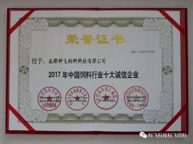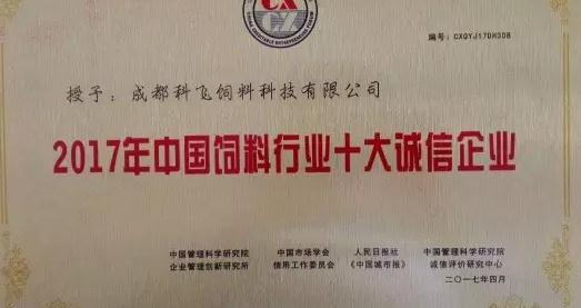 熱烈祝賀成都科飛飼料科技有限公司榮獲“2017年中國(guó)飼料行業(yè)十大誠(chéng)信企業(yè)”的稱號(hào)。